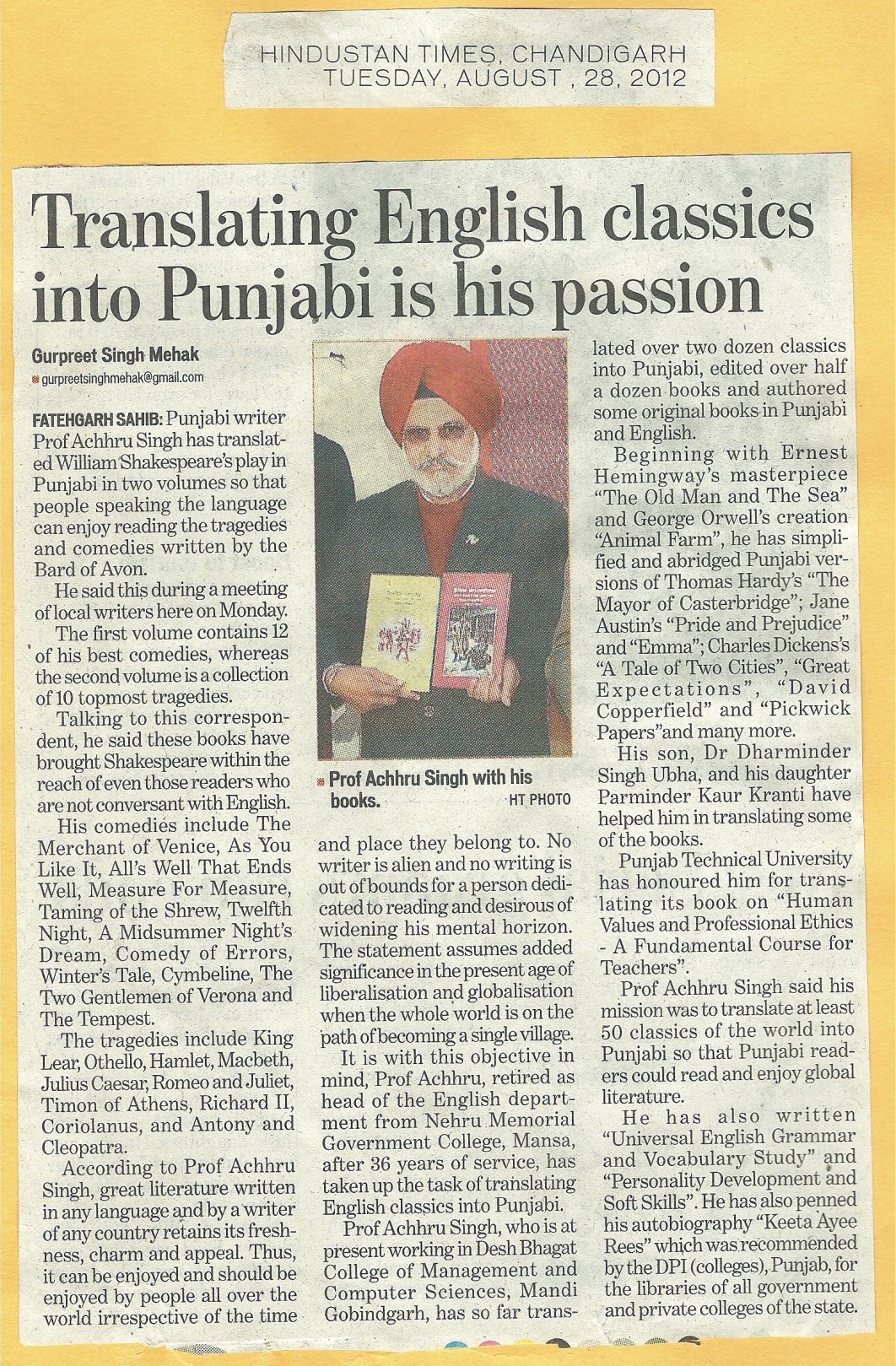 Punjabi writer  Prof. Achhru Singh has translated William Shakespeare Play in two volumes.Translating English classic into Punjabi in his passion